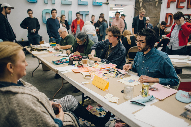 Hot Hands is an annual live drawing and fundraising event, featuring works made on the spot local artists, established and emerging alike, each priced at $30. Throughout the night, artists draw, paint, print, tape, and collage on 8.5 x 11” sheets of paper. When their pencils go down, each work is hung on the gallery wall for immediate sale. Our 2016 event was hosted at the Drug Store Studios, KCMO. All proceeds from the night directly benefit Front/Space and the artists we support.