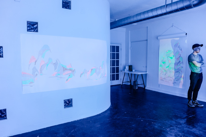 Hue shan shui is the unveiling of video and projection artist Ham Dorries’ latest series of paintings. With gouache and a steady hand, Dorries articulates large scale landscapes with overlayed video projections to create an ever shifting surface. Taking influence from the methods and teachings of Chinese landscape painters, she generates landscapes from a mind that is possessed by digital media.